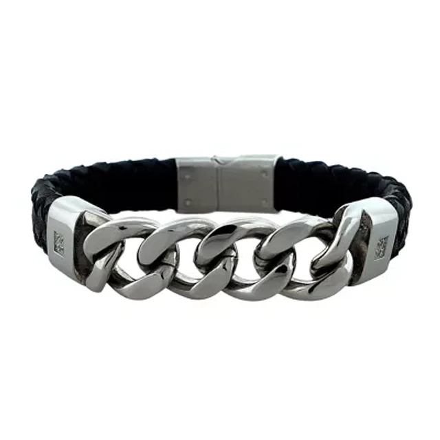 Mens Cubic Zirconia Stainless Steel & Leather Bracelet