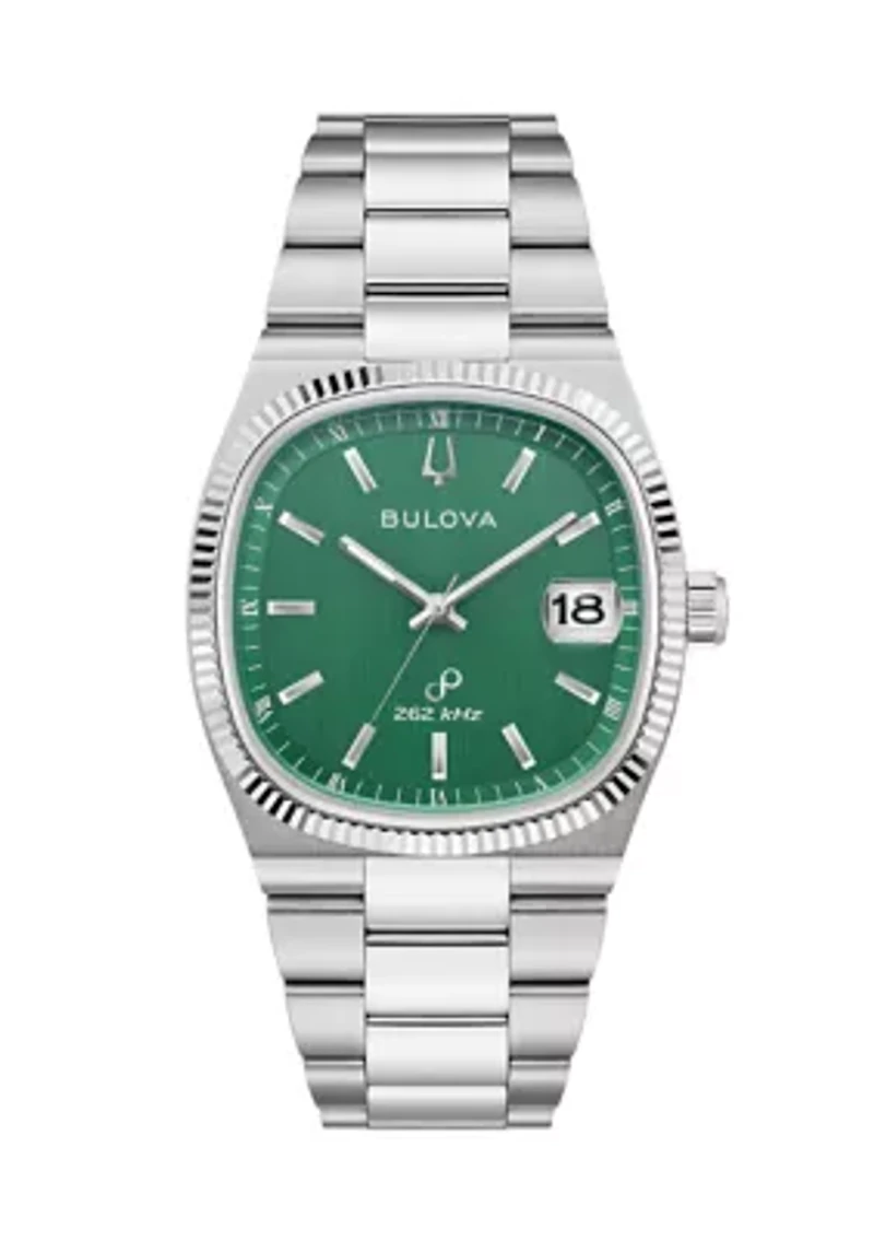 This men's watch from Belk & Co. seamlessly blends retro aesthetics with modern technology. The 38-millimeter silver-tone stainless steel case transitions into an integrated 3-link bracelet with a secure push-button deployant clasp. The verdant vertical brushed green dial features polished hands and indices, with a date display at 3 o'clock. Powered by our high-precision quartz Precisionist movement, it offers remarkable accuracy and resistance to temperature changes. Embrace effortless elegance with this timeless timepiece. Foldover clasp closure Analog dial Quartz movement Polished finish Calendar display 3-year limited liability warranty available Imported Belk Exclusive Product Specifications 42.5 mm x 37.5 mm Material & Care Stainless steel Clean with a soft bristle brush and warm soapy water