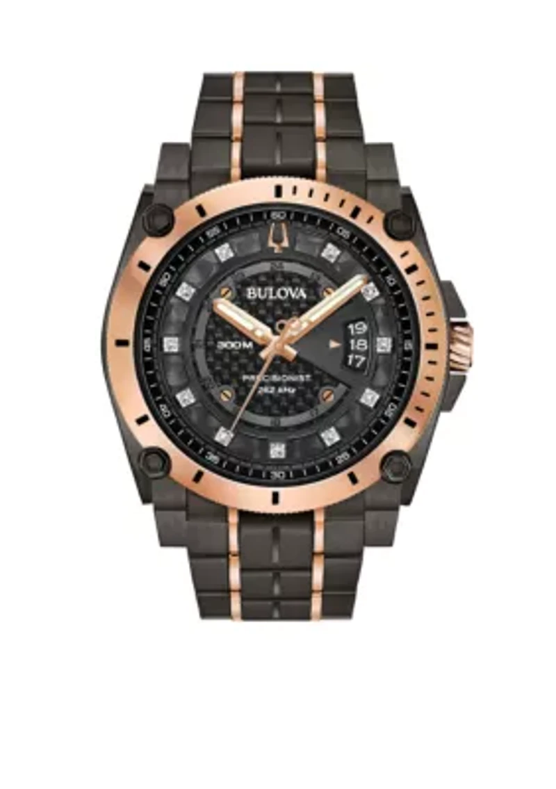 New Champlain style in grey IP stainless steel with rose gold-tone accents on case and bracelet, 11 diamonds individually hand set on two-tone black/grey dial with calendar feature, curved mineral glass, screw-back case, fold-over buckle closure with safety lock and extender, and water resistance to 300 meters. Powered by Bulova’s proprietary three-prong quartz crystal Precisionist movement with a 262kHz vibrational frequency—eight times greater than standard watches—for unparalleled accuracy. Diameter: 46.5 mm round case; Thickness: 14.3 mm Foldover buckle clasp; metal band Dial: gray and rose gold-tone with diamond-accent indices and date window; Movement: three-hand quartz Calendar display Water resistant up to 300 meters 3-year limited warranty Imported Material & Care Stainless steel Requires specialty care