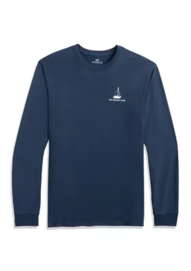 This Southern Tide t-shirt features a relaxed fit and a charming sailboat lights graphic, perfect for a casual holiday night. Rib crew neck Long sleeves Screenprint front and back Imported Material & Care 60% cotton and 40% polyester Machine washable
