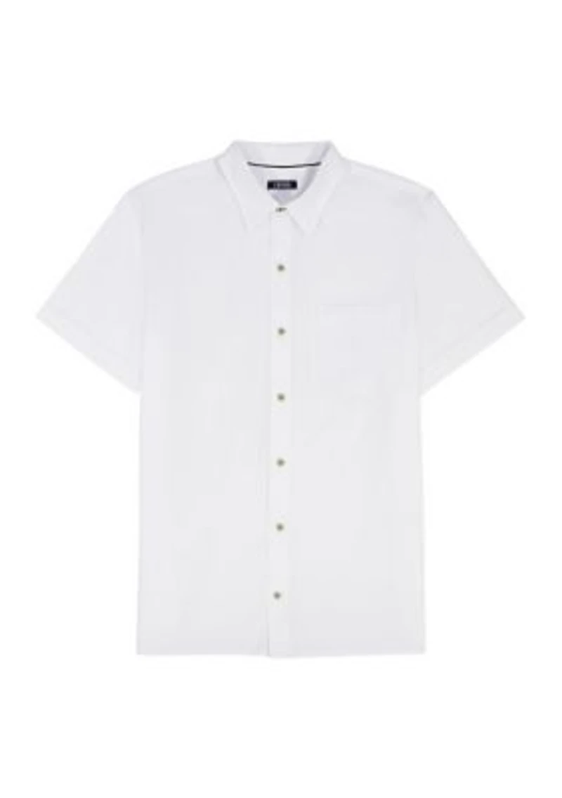 This IZOD button-down shirt is styled with short sleeves, a camp collar and the perfect untucked length. Cut in a cooling, breathable linen blend that’s also conveniently machine washable. Button closure Point collar Short sleeves Imported Material & Care 60% cotton, 40% polyester Machine washable