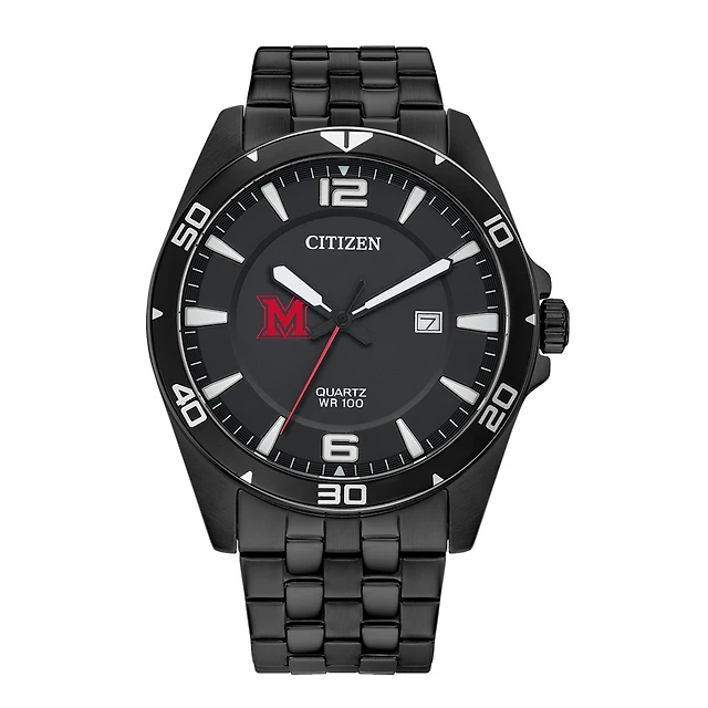Men's Miami University RedHawks Citizen Quartz Black-Tone Stainless Steel Watch