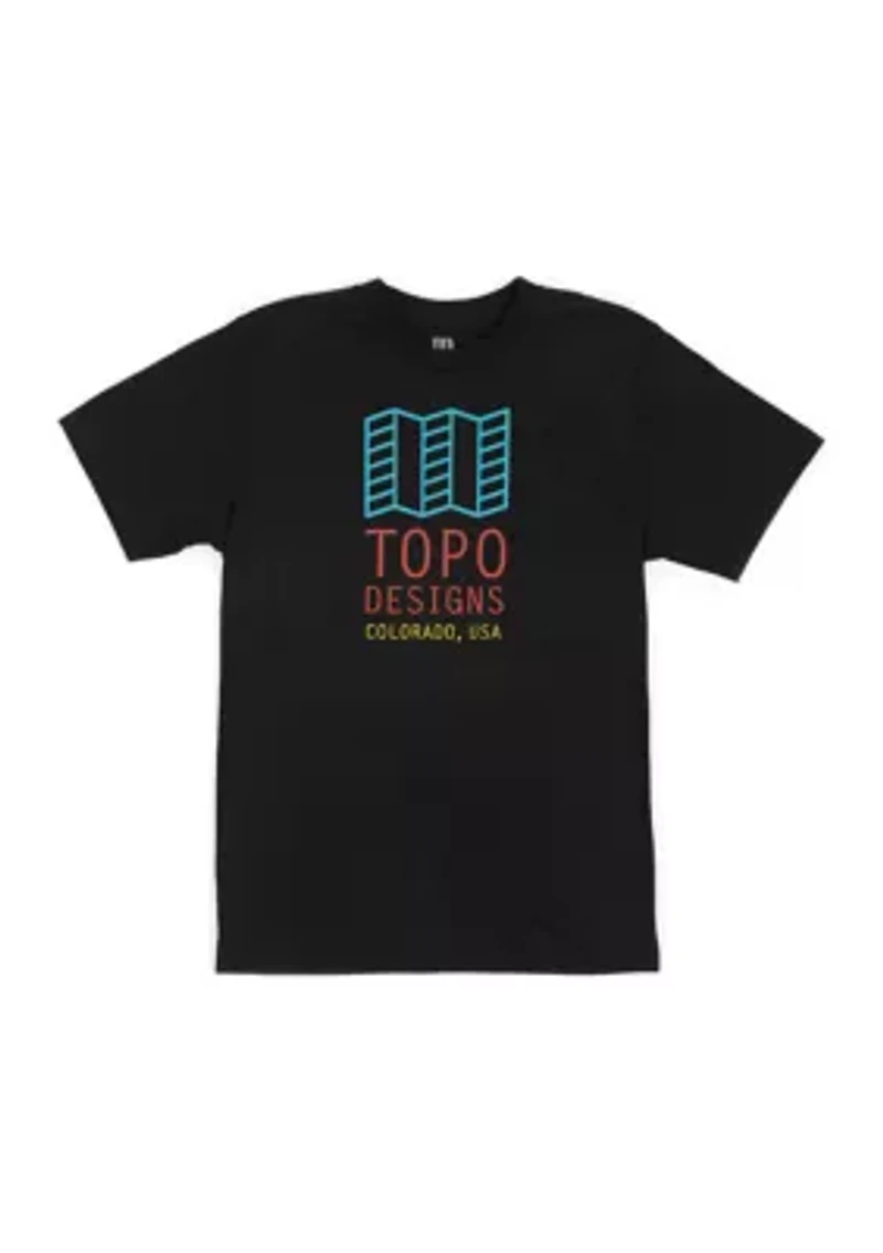 Crafted in-house, this t-shirt by Topo Designs comes with a colorful script that includes a map graphic on top of the shirt. Pullover Crew neck Short non-cuffed sleeves Imported Material & Care Cotton Machine washable