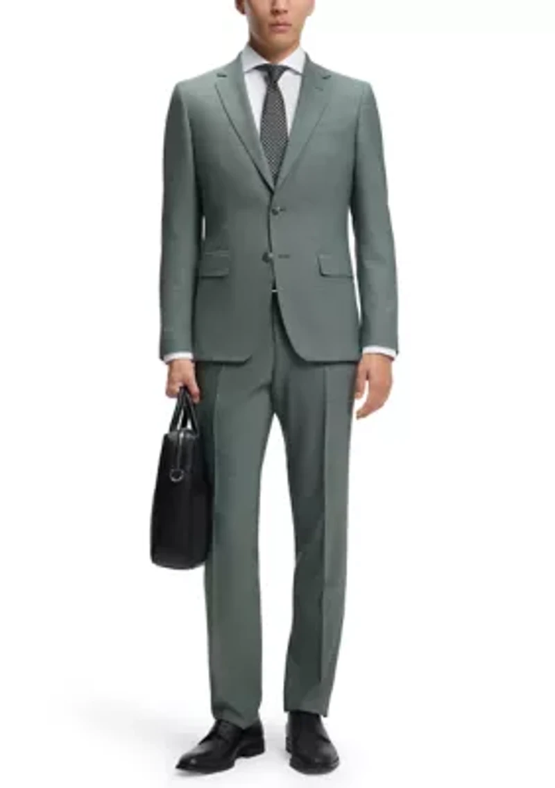 Create cutting-edge business looks with this two-piece HUGO BOSS Menswear suit. Tailored to a clean slim fit, this ensemble is crafted in lightly patterned fabric blended with virgin wool, linen and stretch. The suit jacket benefits from notch lapels, constructed shoulders and a buttonhole. 2 Slim fit Imported Material & Care 52% Polyester, 24% Virgin wool, 20% Linen, 4% Elastane, Lining: 95% Polyester, 5% Elastane, Sleeve lining: 95% Polyester, 5% Elastane, knee lining: 100% Viscose Dry clean only