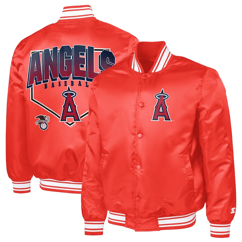 Show your Los Angeles Angels pride with this Home Plate Satin Full-Snap Varsity Jacket from Starter. The lightweight satin fabric is suited for mild temperatures and layering, making it perfect for transitioning between seasons. Rib-knit striping on the collar, cuffs, and hem provides a durable stretch and adds a touch of classic varsity style.