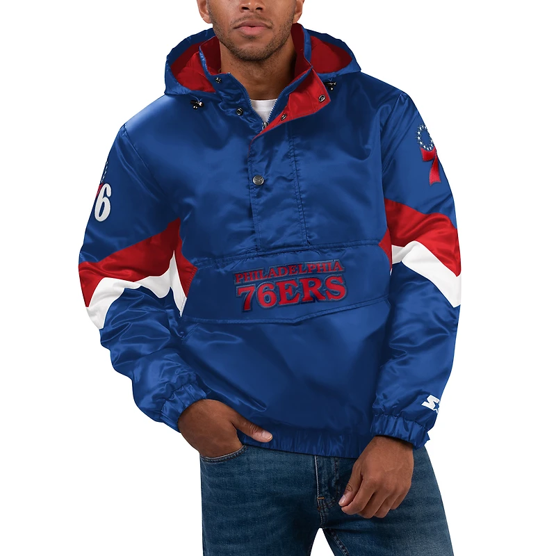 Represent your Philadelphia 76ers with style and comfort in this Starter Force Play Satin Hoodie Half-Zip Jacket. This midweight pullover features embroidered Philadelphia 76ers graphics and a front pouch pocket for convenient storage. The zippered detachable hood and adjustable toggles provide extra protection from the elements, while the elastic cuffs and bottom hem ensure a snug fit. Whether you're courtside or watching from home, this pullover will keep you warm and stylish while you cheer on the Philadelphia 76ers.