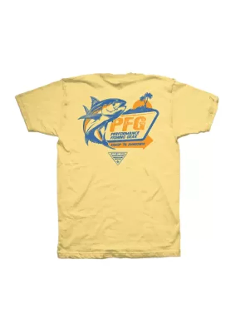 This Columbia t-shirt features a graphic print on the front and back and is a versatile option for everyday wear. Crew neck Short sleeves Imported Material & Care 100% cotton Machine washable