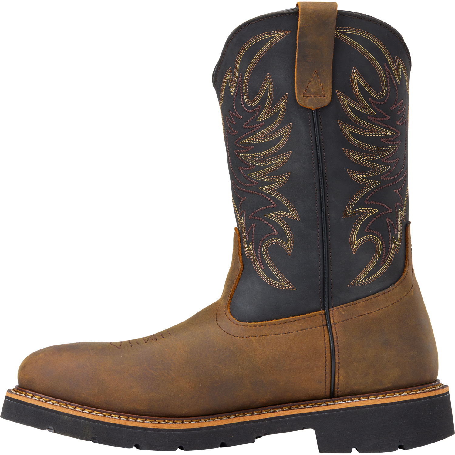 Just imagine how much hassle you’ll avoid by trading in your traditional lace-up work boots for these rugged Wellingtons. A favorite among cowboys and construction workers, these quality-built pull-ons are handcrafted in Wisconsin by Thorogood® makers so picky, they reject 5 times more leather hides than others do. The abrasion-resisting full-grain leather upper is supple right out of the box – and you’ve gotta admit that fancy tri-tone stitching on the shaft gives `em an extra shot of pizzazz. Inside, a removable Ultimate Shock Absorption™ footbed and resilient Poron® comfort cushion insole soak up the impact of every step. Goodyear® storm welt construction means the uppers are double-stitched to the soles, so they won’t come unglued like cheap wannabes do. Underfoot, the MAXwear™ 90 outsole meets ASTM standards for oil, slip and electric shock resistance. Isn’t it time you stepped up to Thorogood boots built with 120+ years of American ingenuity?