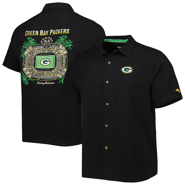 Men's Tommy Bahama Black Green Bay Packers Top of Your Game Camp Button-Up Shirt