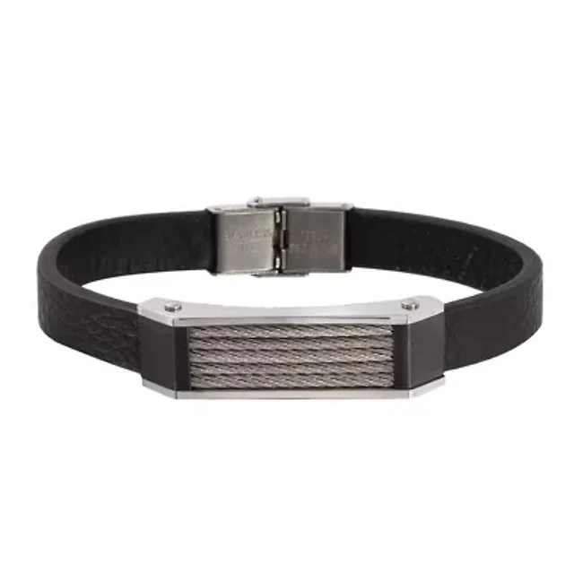Our men's leather bracelet features a thick band showcasing polished stainless steel cables framed in smooth stainless steel and black ion plated stainless steel. Bold black leather supports a gleaming grill to create a unique, modern style.
