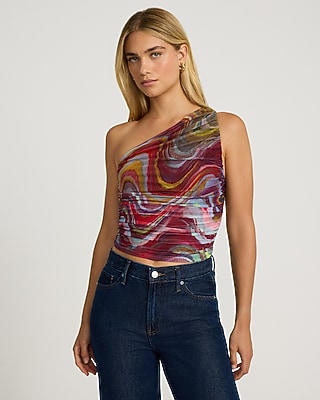A one shoulder tank top with a double lined mesh fabric with a wavy colorful print and a flattering ruched design.