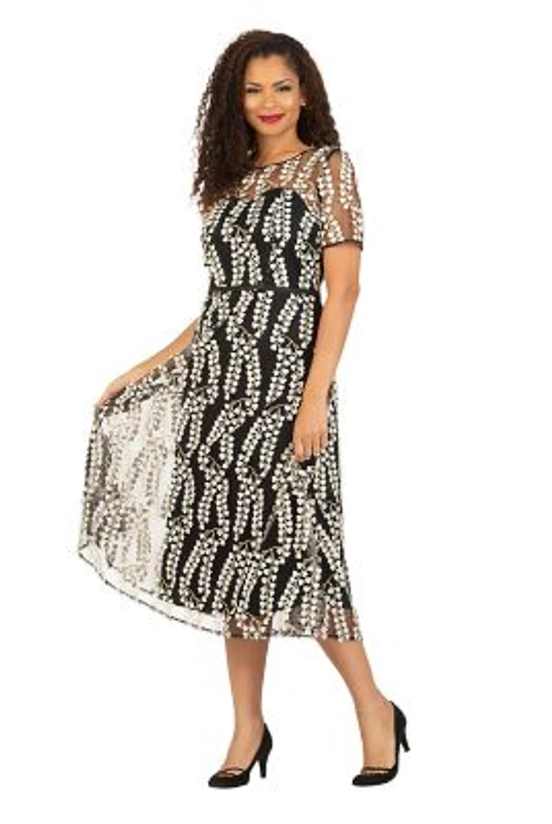 Where sophistication meets artistry. This breathtaking lace dress is designed to captivate with quiet confidence. Set against a rich black backdrop, delicate ivory embroidery cascades like falling leaves — creating a look that is both timeless and unforgettable. The sheer illusion neckline and sleeves offer graceful coverage while adding a touch of romance and refinement. A defined waistline shapes the silhouette beautifully, and the flowing lace overlay moves effortlessly with every step. From the intricate front detailing to the elegant sheer back, every angle speaks of craftsmanship and poise. Perfect for Sunday service, evening celebrations, weddings, or formal occasions, this dress is for the woman who appreciates beauty in the details and power in simplicity. Classic black. Soft ivory. Unmistakable grace. Because true elegance is never loud — it is simply seen, felt, and remembered. Zip closure Crew neck Short sleeve Imported Product Specifications 49 Material & Care Lace Dry clean only