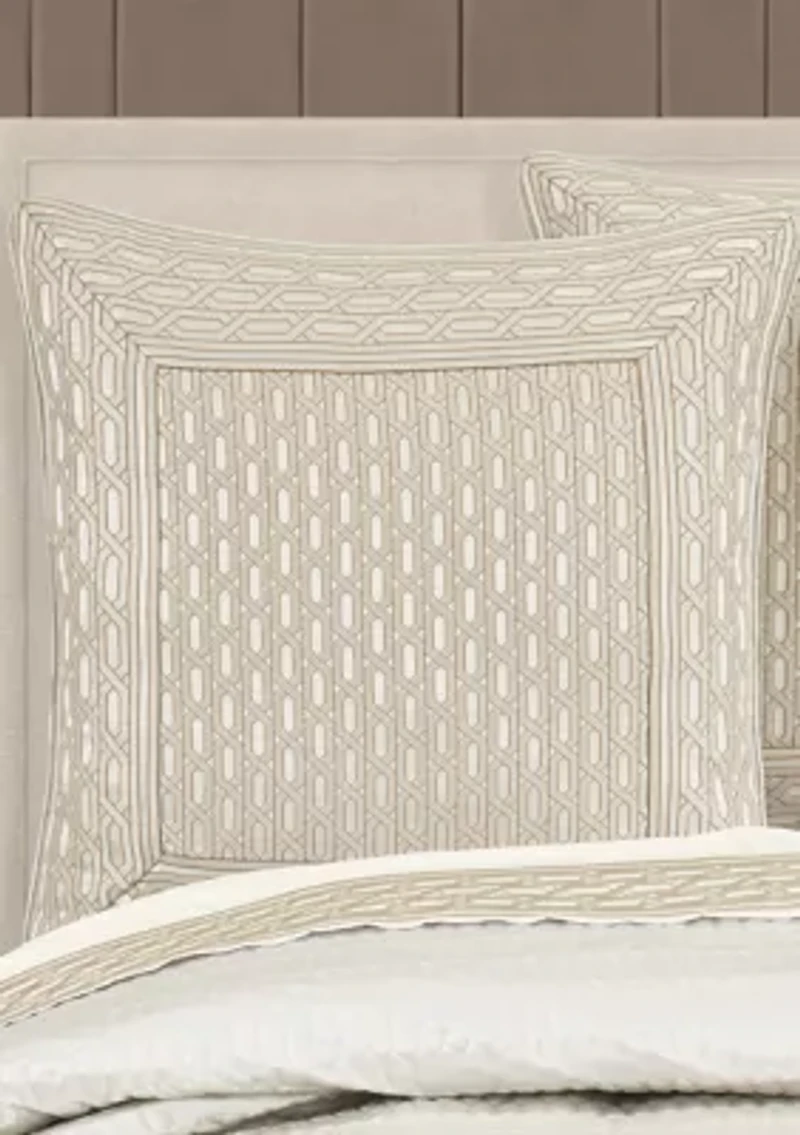 The Metropolitan Euro Sham is constructed with an ivory woven geometric pattern, framed by a chain-link border, which utilizes a unique embossed technique. This highly detailed Euro sham features a hidden zipper closure and is made to coordinate with the Metropolitan bed set for a complete look. (Each sham is sold separately). 1 piece(s) included Firmness: firm Geometric pattern CN Imported Product Specifications 26 -in. x 26 -in Material & Care Polyester Dry clean only