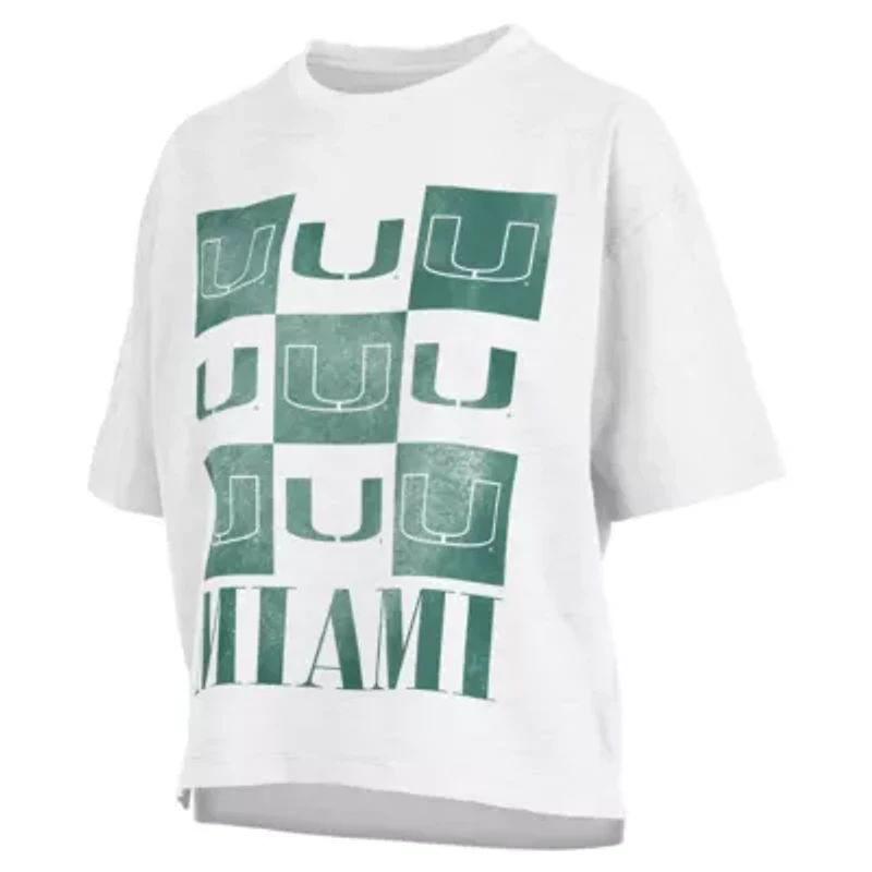 Celebrate your unwavering Miami Hurricanes spirit with the Pressbox White Miami Hurricanes Motley Crew Andy Waist-Length Oversized T-Shirt. This oversized tee features a waist-length design, dropped shoulders, and a droptail hem with side splits for a relaxed and stylish fit. Distressed screen-print graphics showcase the iconic Miami Hurricanes logo, making it the perfect way to show your support for your favorite team. Whether you're cheering from the stands or simply representing your Hurricanes pride, this oversized t-shirt is a must-have for any devoted fan. Brand: Pressbox; Crew neck; Distressed screen print graphics; Dropped shoulders; Droptail hem with side splits; Imported; Machine wash, tumble dry low; Material: 100% Cotton; Officially licensed; Oversized fit; Short sleeve; Waist length. PK-Pakistan Imported Material & Care 100%Cotton Machine washable or hand wash for best results