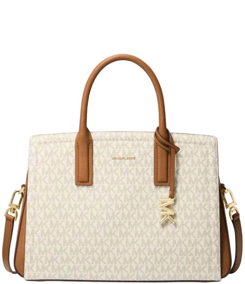 From Michael Kors, the Laila Medium Satchel Bag features: Michael Kors signature coated twill Magnetic closure Gold tone hardware Interior details - 1 back slip pocket, 1 center zip pocket, 1 back zip pocket Approx. 94" handle drop Approx. 19.5" - 22.5" adjustable crossbody strap drop Approx. 11.5" L x 8.75 H x 5.5" W Imported.