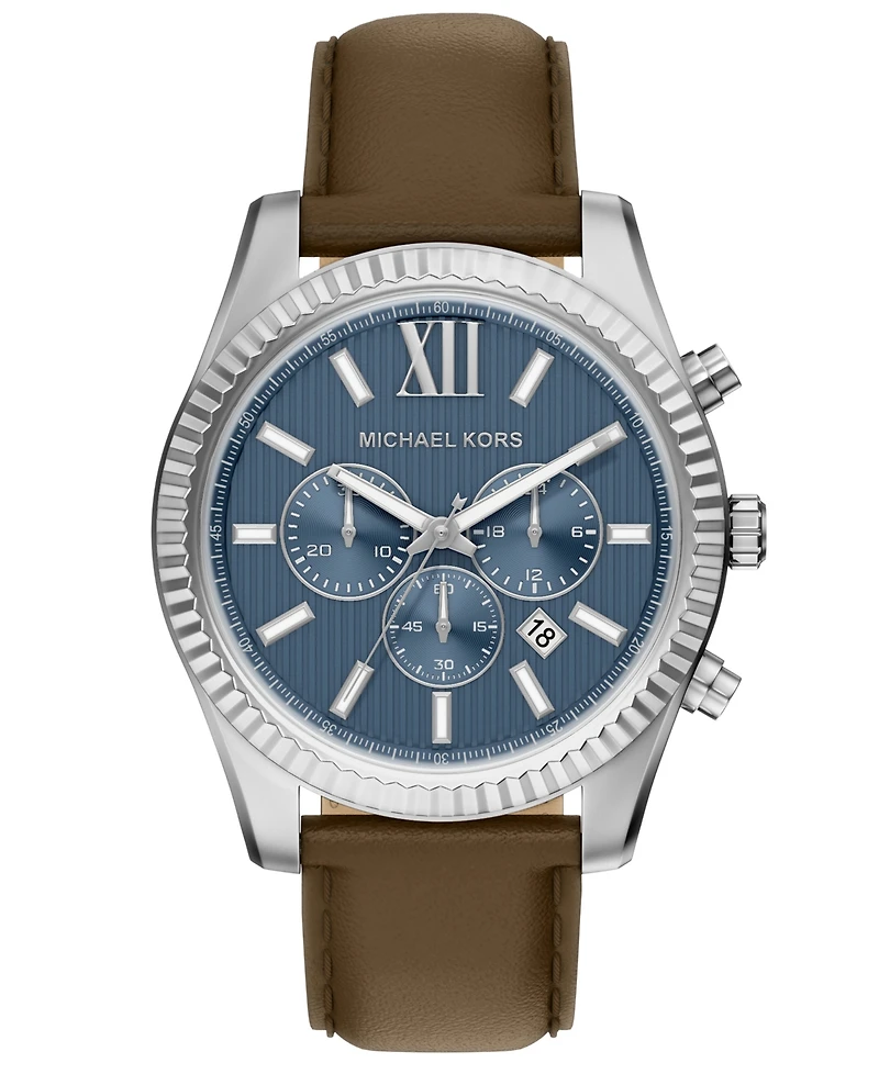 The iconic Lexington takes on a refined new look with a brown leather strap and silver-tone 45mm case. Featuring a chronograph movement and a blue dial with subtle vertical detailing, it delivers a sharp balance of sophistication and everyday versatility. Style MK9258