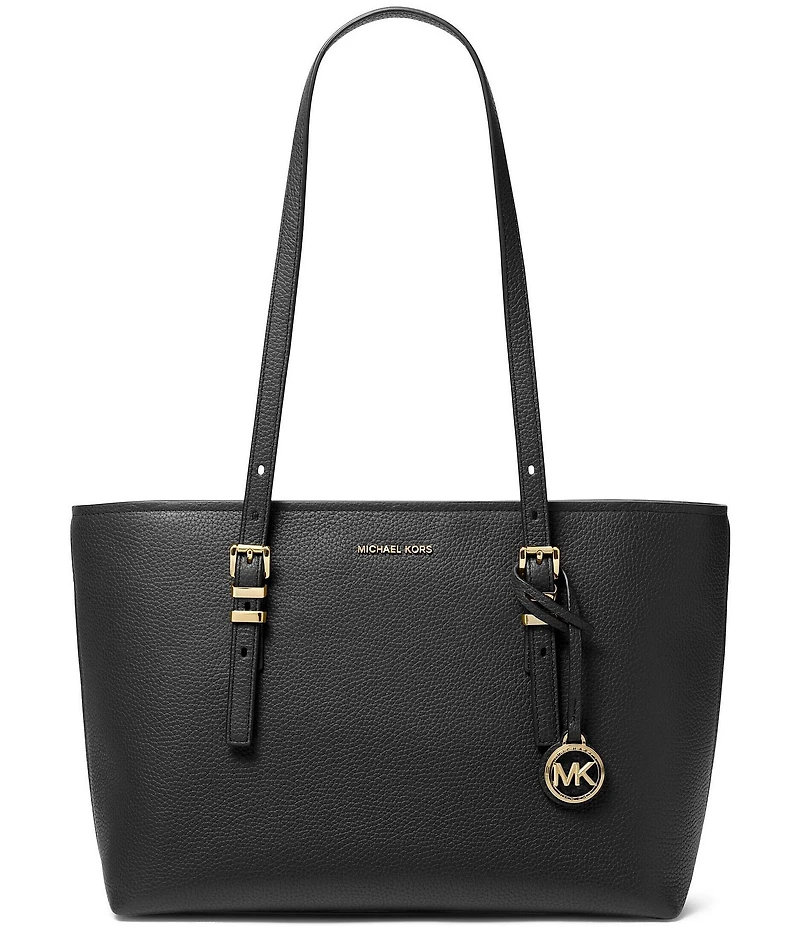 From Michael Kors, the Quinn Medium East West Top Zip Tote Bag features: Pebble embossed leather Gold hardware Zip closure Interior details: 1 back zip pocket, 2 front slip pockets Approx. 15'' L x 9'' H x 4'' W Approx. 10.75'' strap drop Approx. 1.47-lbs Imported.