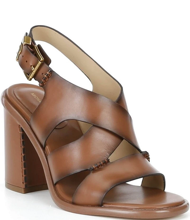From Michael Kors, the Raven Burnished Leather Ankle Strap High Heel Sandals feature: Burnished vachetta leather upper Ankle strap with buckle closure Synthetic lining Rubber outsole Approx. 3.75" heel height Imported.
