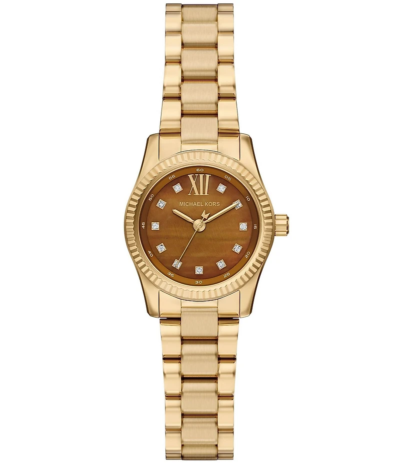 From Michael Kors, this women's watch features: Gold tone stainless steel bracelet and case Genuine tiger's eye dial 2 pusher fold over clasp closure Quartz three hand movement Case size approx. 26mm Case thickness approx. 8mm Band width approx. 14mm Water resistance: 5 ATM Imported.