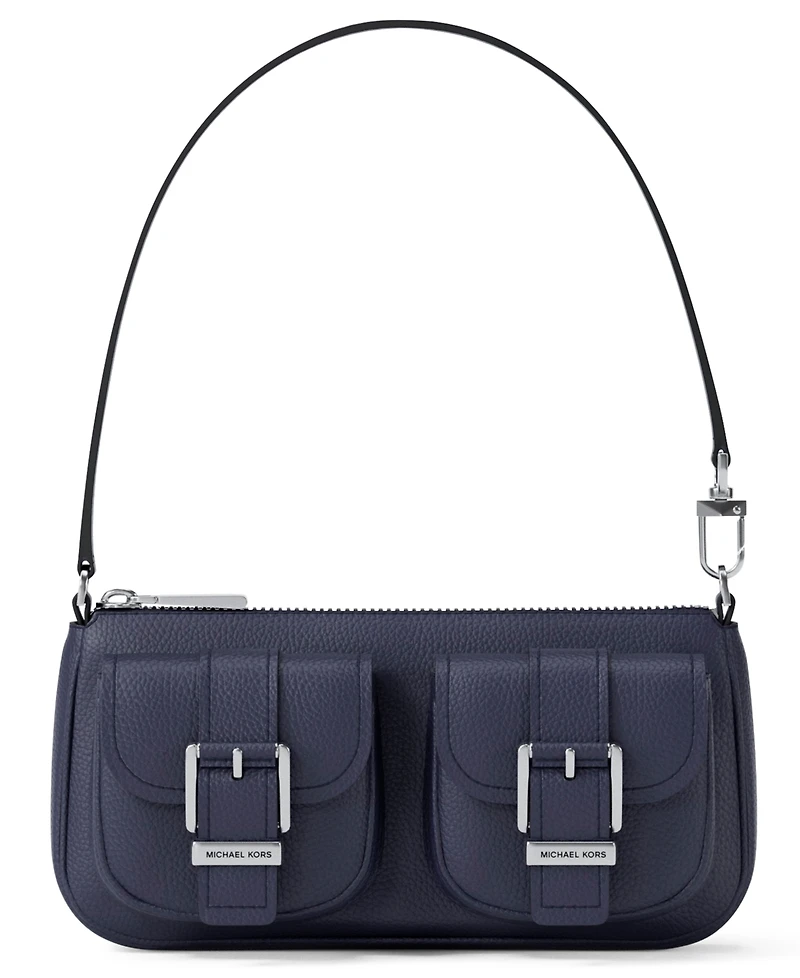Defined by the handy exterior pockets with decorative buckles, this handbag by Michael Michael Kors is crafted in leather with a comfortable shoulder strap.