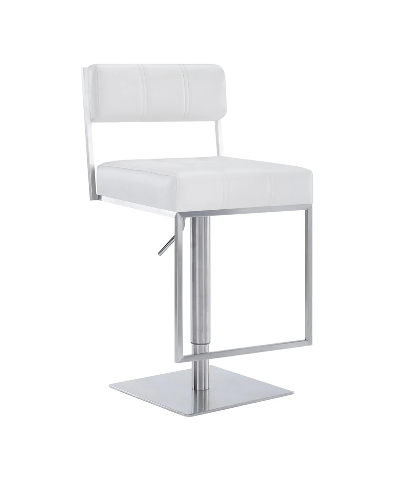 The Michele barstool is adjustable and has a range of 25-34 inches in height. Covered in faux leather with a stainless steel base, the Michele barstool will add a touch of modern elegance to your home bar or dining room.