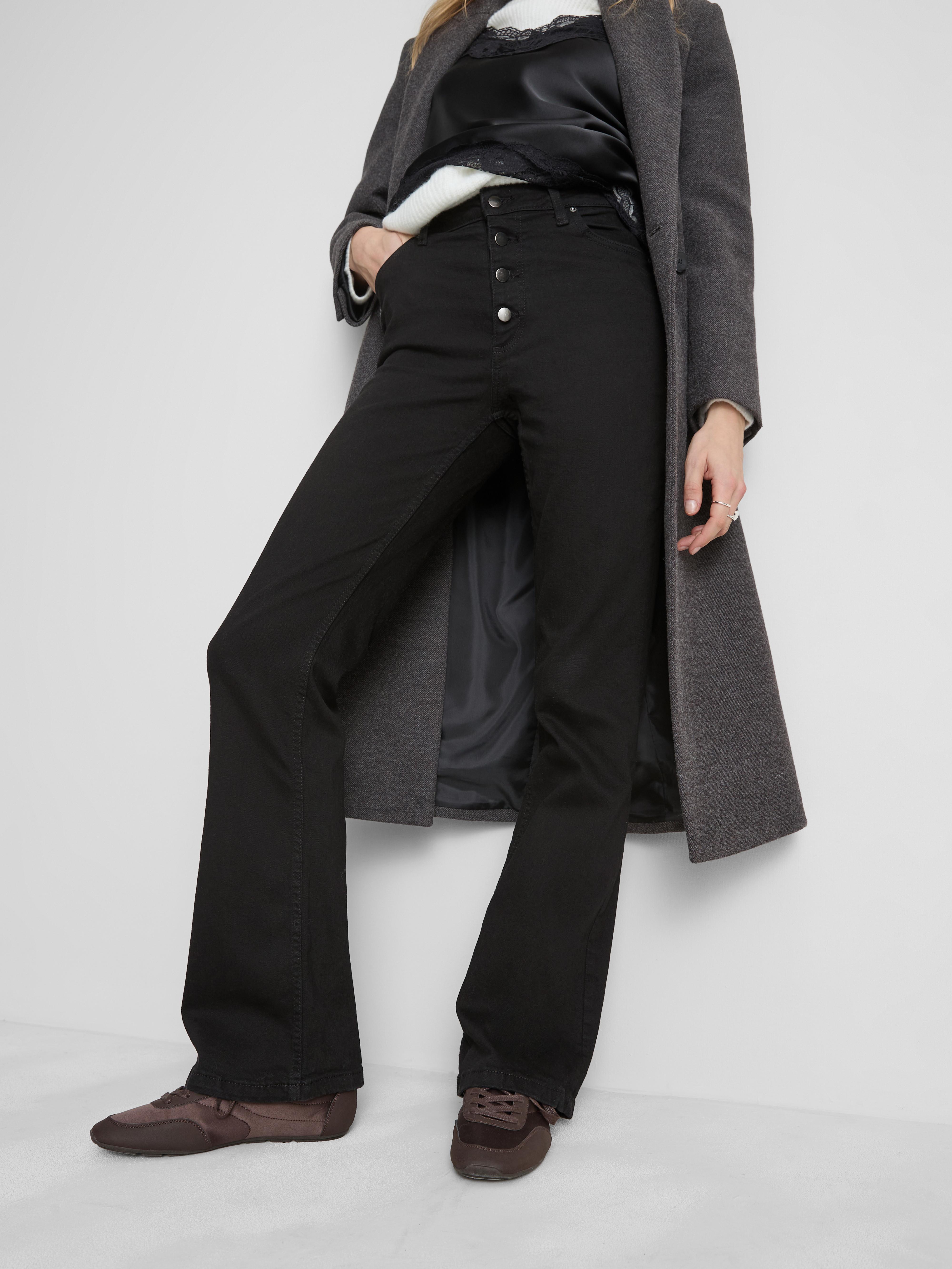 Timeless black bootcut jeans with a comfy mid rise and classic button-up design