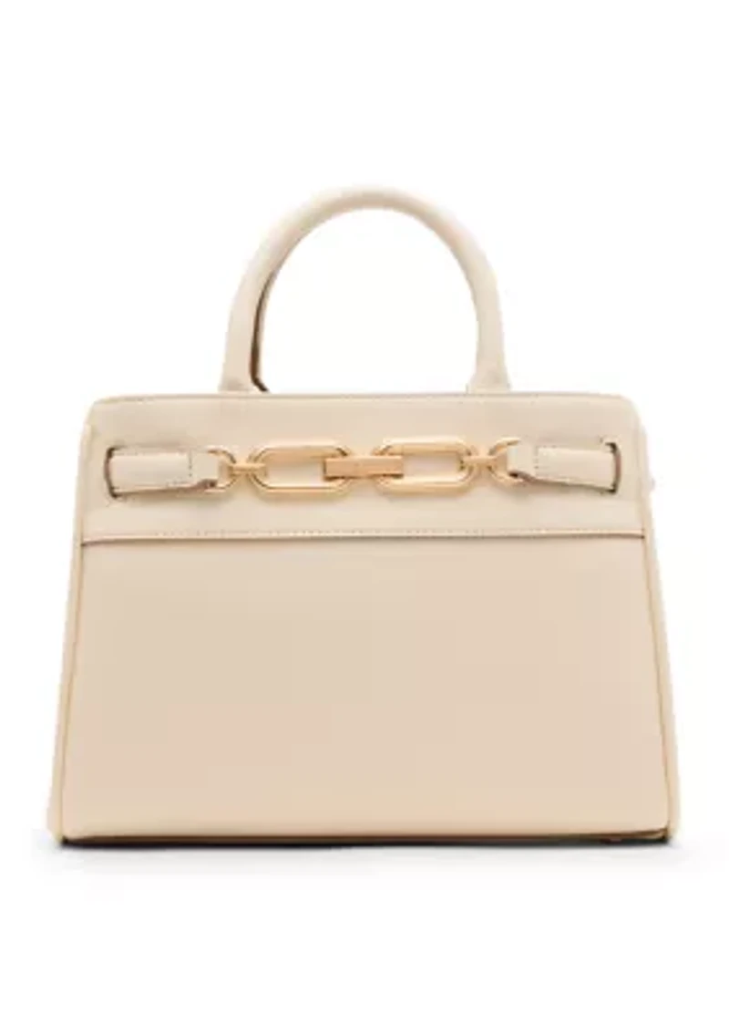 Add a touch of elegance to any look with this Anne Klein satchel bag. Its unique buckle design offers a chic vibe that effortlessly elevates any outfit. 3.7" handle drop, 24" strap drop Convertible strap Exterior: gold chain link hardware Interior: one zip pocket, two slip pockets Imported Product Specifications 7.5" H x 10.1" L x 4.3" D Material & Care Self-color stitch trim PVC Clean with a damp cloth or soft brush