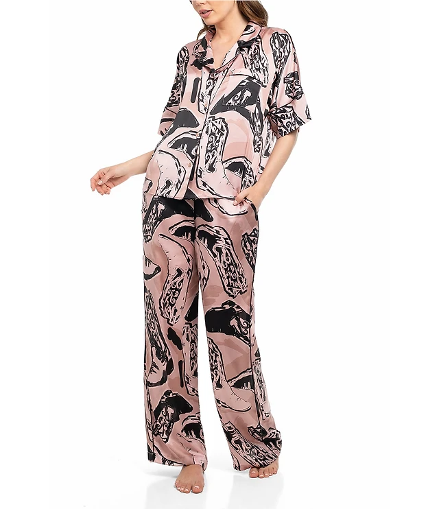 Midnight Bakery Western Boot Print Short Sleeve Notch Collar Satin Long Pajama Set