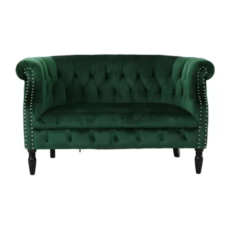 Refine your home with charming antique styling that a true connoisseur will recognize. This chesterfield-style loveseat is the ideal addition to any living room with its classic design and traditional elements such as deep button tufting, scrolled arms, and nail head accents. Featuring soft velvet upholstery, this loveseat stands as a streamlined statement piece that can change the whole flow of your living room, creating an open, clean space. Finished with beautifully turned legs, our loveseat provides an elegant touch to any room.