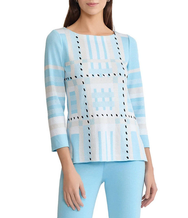 From Ming Wang, this tunic features: Soft knit fabrication Interwoven pattern Boat neckline Bracelet sleeves Straight hem Pullover construction Approx. 26" length Rayon/polyester Hand wash Imported.