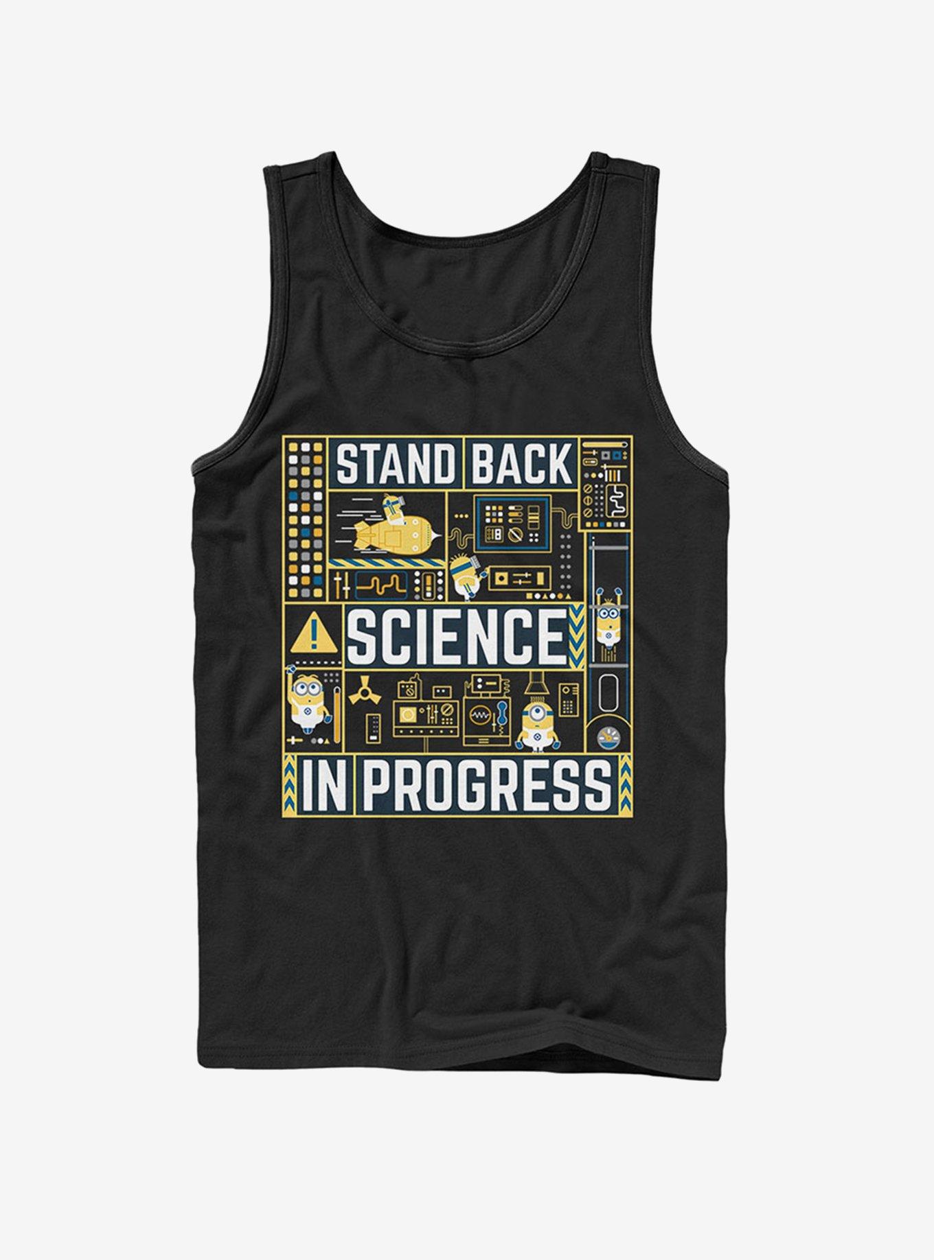 Get your Bunsen Burner and the Despicable Me 3 Minions Science in Progress Men's Tank Top because we're about to invent something amazing! The Minions are portrayed in Gru's lab with "Stand Back Science in Progress" in white across the front of this funny men's Despicable Me muscle tee.