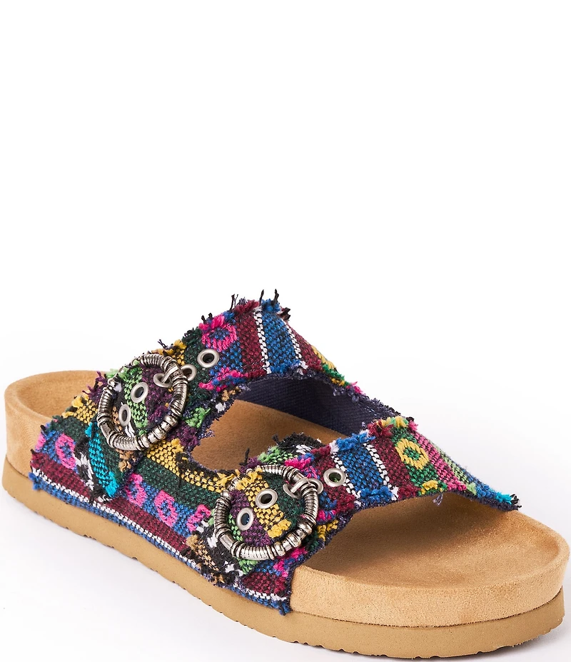 From Minnetonka, the Georgine Shadow Geo Buckled Platform Slide Sandals feature: Fabric upper Slip on with adjustable buckled straps Fabric lining Soft contoured footbed Lightweight EVA outsole Approx. 1.25" platform height Imported.