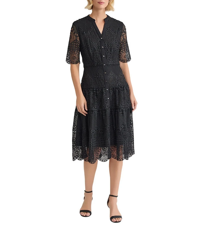 From MISOOK, this dress features:  Woven lace fabrication  Split v-neckline  Short sleeves Tiered skirt  Scallop trim  Attached liner Button front closure  Approx. 45" length  Polyester/spandex Hand wash  Imported.