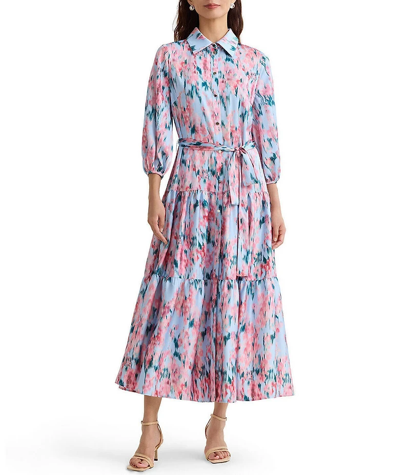 From MISOOK, this dress features: Crepe fabrication Floral print Point collar neckline 3/4 puff sleeves Tie waist detail Bust darts Drop waist silhouette Tiered skirt Straight hem Button front closure Approx. 52" length Polyester Hand wash Imported.