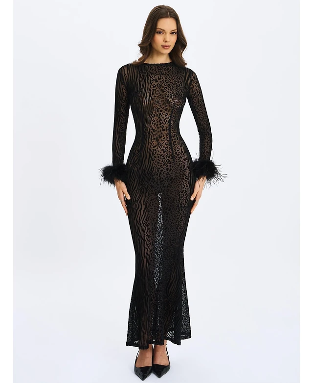 Miss Circle Women's Patricia Black Leopard Burnout Velvet Mesh Backless Maxi Dress