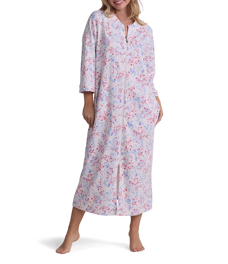 Miss Elaine Floral Print 3/4 Sleeve Round Neck Terry Knit Long Zip Robe