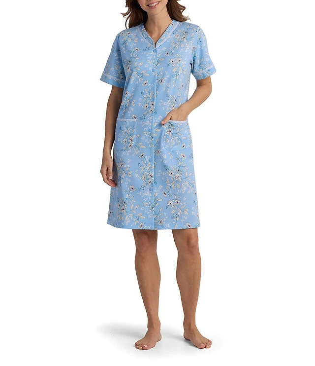 Miss Elaine French Terry Knit Floral Print Short Sleeve Snap-Front Short Robe