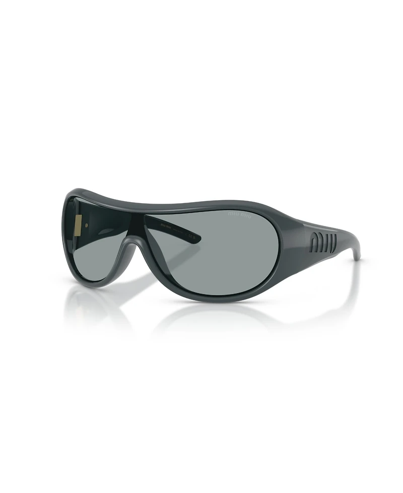 Make a bold statement with the Miu Miu Mu B14SU sunglasses, a standout from the Spring/Summer 2026 runway. Featuring irregular full-rim frames in grey with shield-style black lenses, they exude retro glamour. Crafted from durable nylon and propionate, wide tapered temples accentuate their striking wraparound design. Universal fit sunglasses ensure comfort without compromising style.
