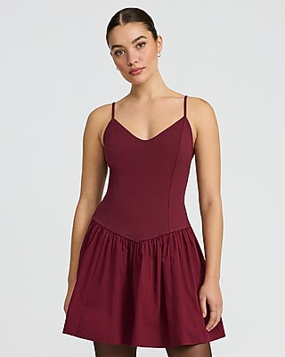 A modern drop waist mini dress style crafted from mixed poplin and knit fabrics with a flattering v-neckline and seam details.