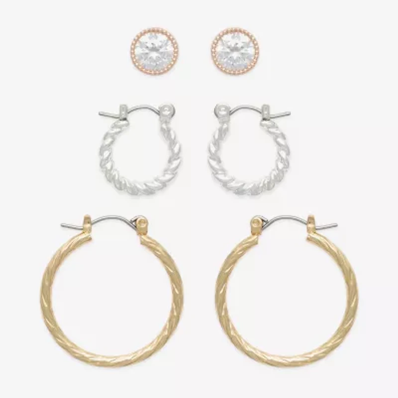 Mixit Two Tone Hoop & Stud Womens Cubic Zirconia 3 Pair Earring Set