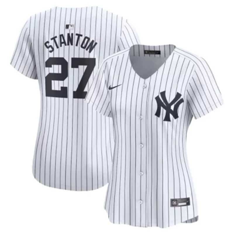 Let everyone know that you are a true New York Yankees fan by grabbing this Giancarlo Stanton Home Limited Player Jersey from Nike. Crafted with breathable double-knit mesh fabric and featuring Nike's innovative Dri-FIT technology, this jersey is designed to keep you cool, dry, and comfortable all game long. The heat-applied twill appliques with faux stitching add an authentic touch, while the embroidered Nike Swoosh and heat-applied woven jock tag showcase the superior quality you expect from Nike. Brand: Nike; Breathable double-knit mesh fabric has a midweight feel (204gsm); Dri-FIT technology wicks away moisture; Embroidered Nike Swoosh and heat-applied woven jock tag; Heat-applied twill appliques with faux stitching; Imported; Jersey Color Style: Home; MLB Batterman silhouette below the back neck seam; Machine wash, tumble dry low; Material: 100% Recycled Polyester; Move To Zero is Nike's journey toward zero carbon and zero waste, helping to protect the future of sport. Apparel labeled sustainable materials is made with at least 75% recycled content.; Nike Limited; Officially licensed; Standard Fit: Not too loose or tight over the body. Size up for a roomier fit or to layer with a sweatshirt.. ID-Indonesia Imported Material & Care 100%Polyester Machine washable or hand wash for best results