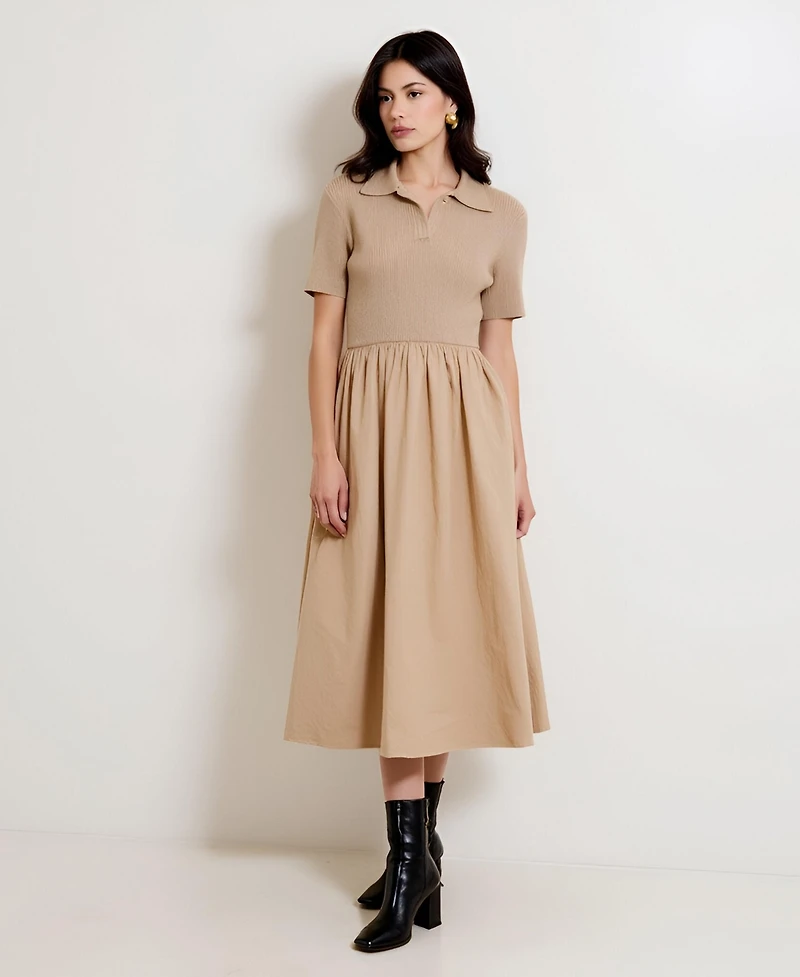 A chic fusion of classic and modern, this midi dress features a soft sweater-knit bodice with a polished polo collar and short sleeves, seamlessly transitioning into a gathered, lightweight woven skirt. The fitted top and flared skirt create a flattering silhouette, and the midi length offers elegant coverage. The textured contrast between the top and skirt adds visual interest and depth.