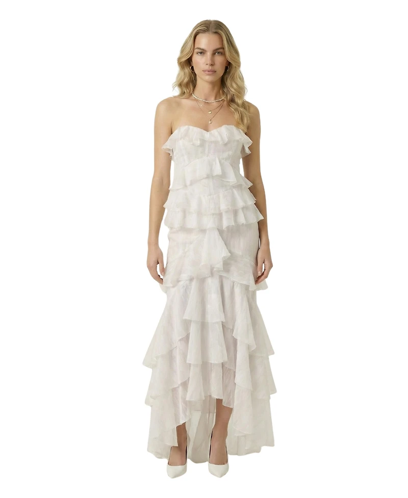Modenaire Women's Strapless Raw Edge Tiered Ruffle Maxi Dress