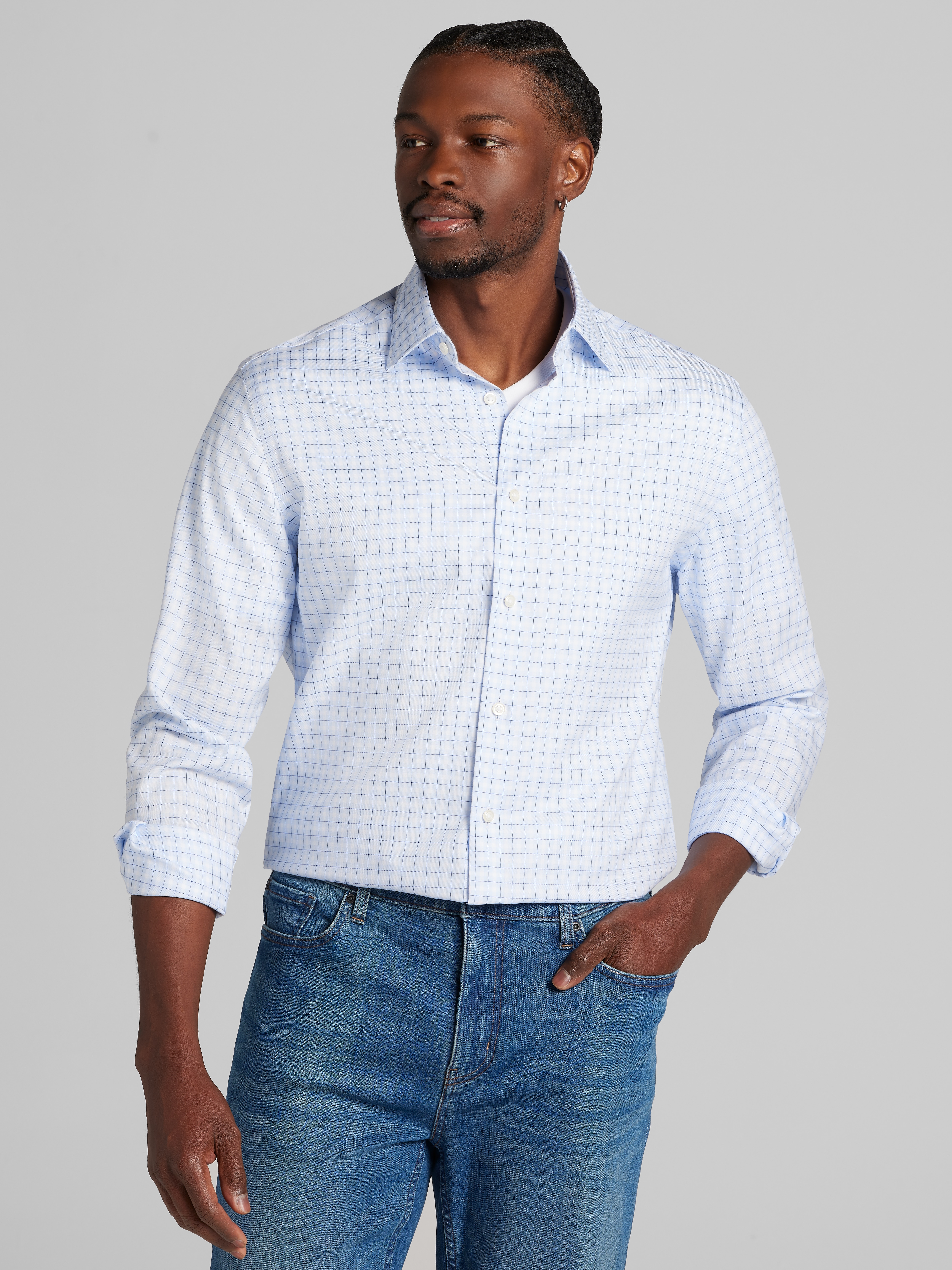 This dress shirt is where sharp meets simple. Made from 100% cotton for ultimate comfort, it features a modern fit that flatters without feeling snug. The sleek plaid design and spread collar bring just enough charm for both the conference room and post-work drinks. Pair it with your favorite dress pants or jeans - it does it all. This is the shirt that works overtime, so you don't have to.