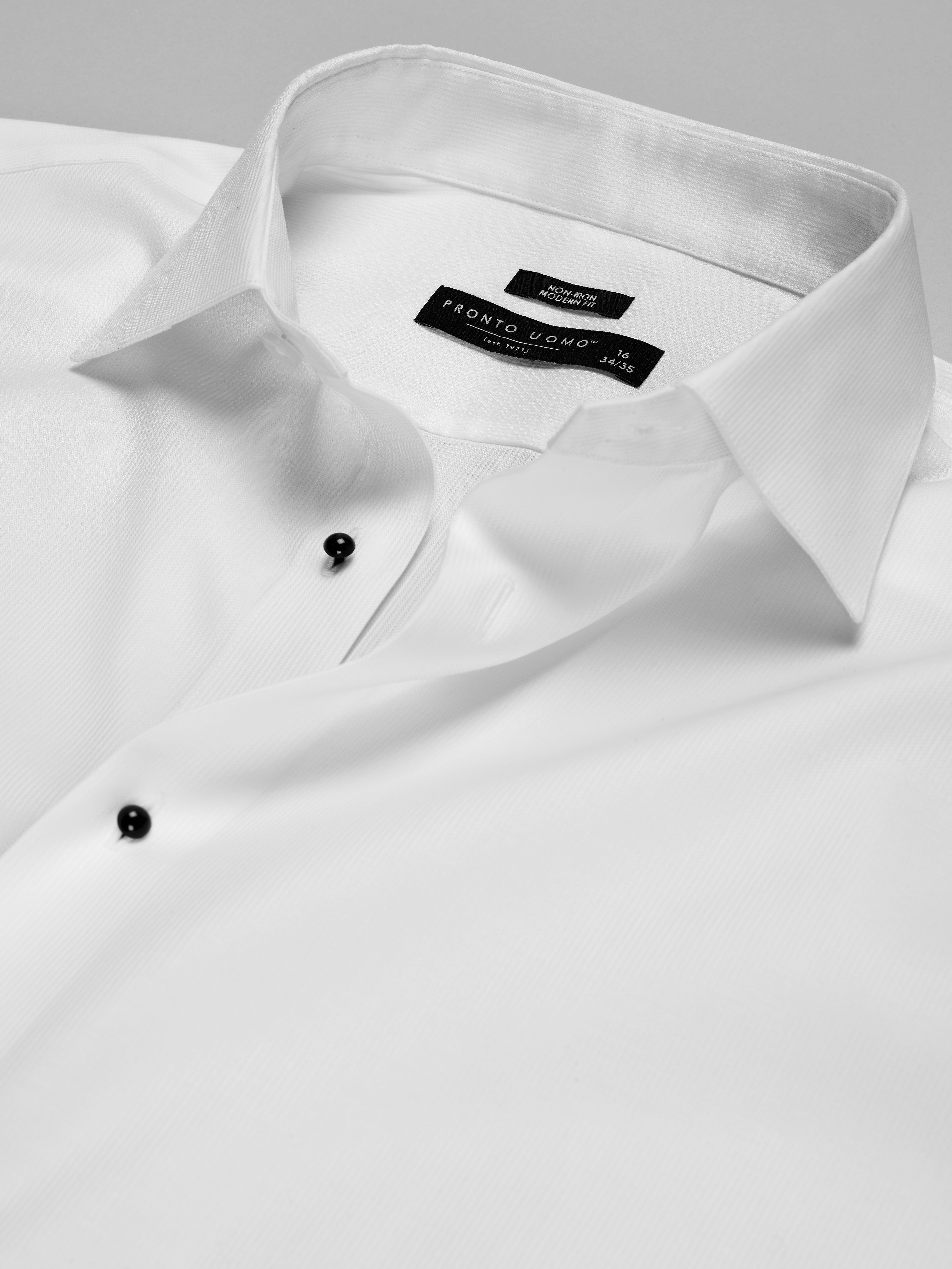 Crafted from a crisp cotton blend with a smooth twill weave, this Pronto Uomo formal dress shirt delivers a polished look with a comfortable feel. The Modern Fit has a trim silhouette that's slightly more relaxed than slim, making it ideal for all-day into evening wear. Its the perfect wingman for your formal events, having you look your best in comfort.