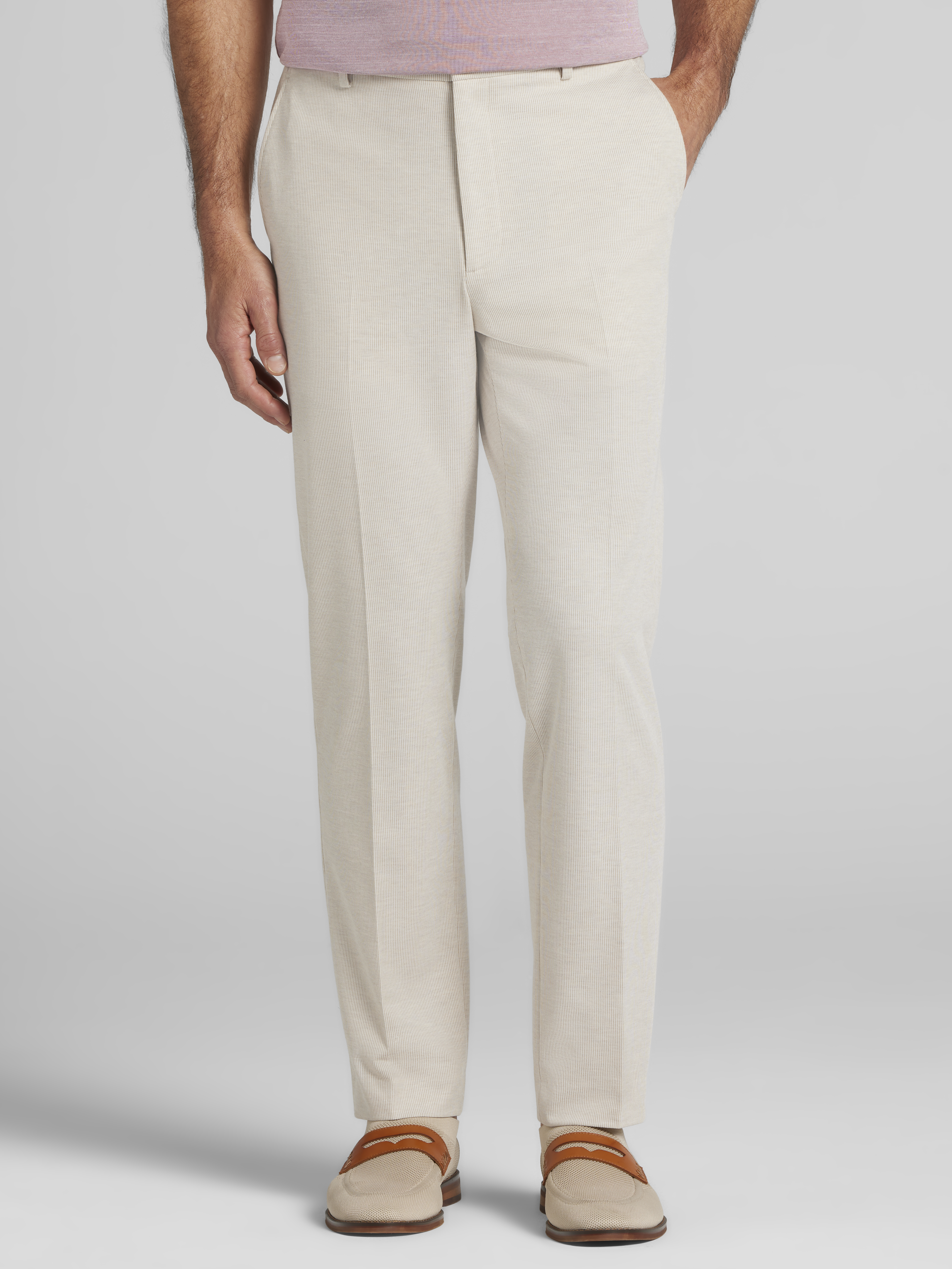 Suit up without sacrificing comfort. These modern fit knit suit pants are your go-to for occasions that demand quiet luxury while keeping you at ease. With a sleek flat front design and subtle tan aesthetic, these pants blend classic tailoring with contemporary comfort. Perfect for prom, a derby event, or a minimalist wedding vibe. The trouser's mid-rise and straight leg flatter any silhouette, promising a sharp look every time. Whether youre making a toast or just making moves, these pants have got your back, well, technically, your legs. Pair them with their matching jacket for the full effect.