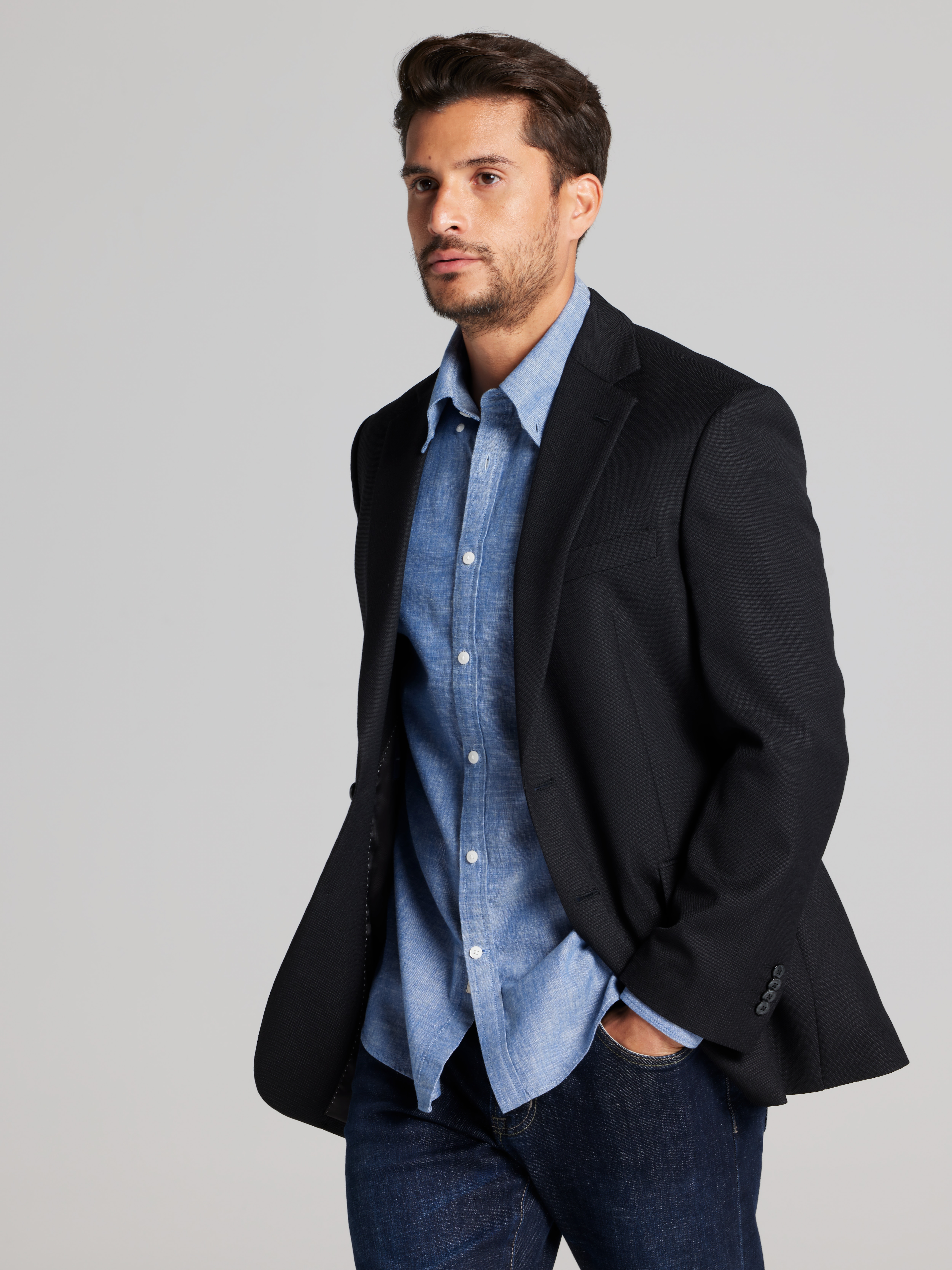 This blazer walks the line between classic and cool like a pro tightrope walker. With its slim, modern fit and timeless notch lapel, it's the wingman you need for work meetings, weddings, or that "Father of the Bride" spotlight moment. Polished yet low-maintenance, thanks to its wool blend with a touch of stretch, it's as comfortable as it is sharp. Minimalist, versatile, and totally crush-worthy - just like your new favorite blazer should be. Dry clean only, because class deserves care.
