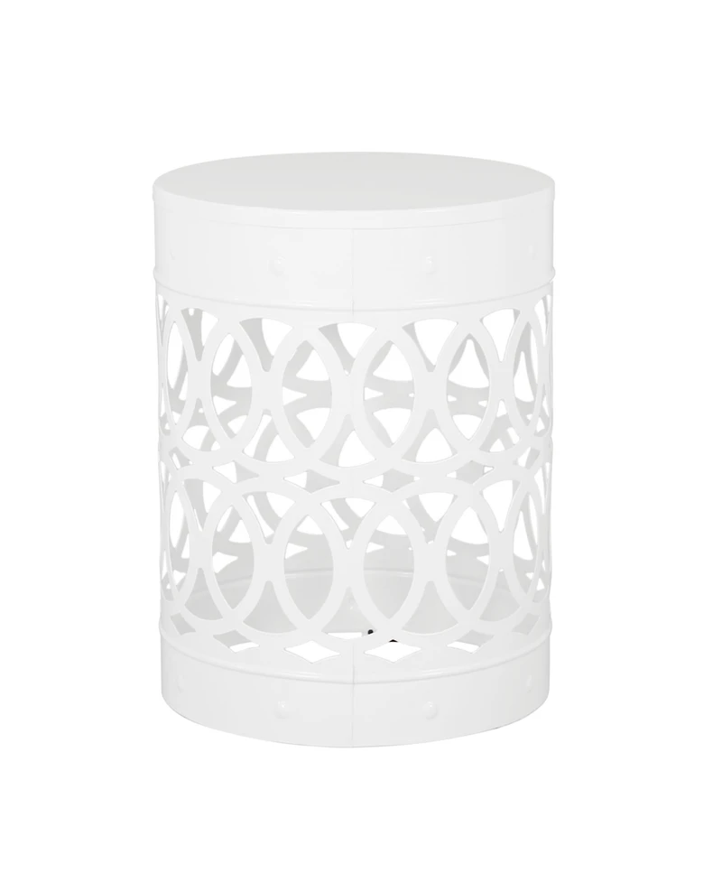 Modern side table with clean lines and a cylindrical iron-cut design. Powder-coated iron frame for durability. No assembly required.