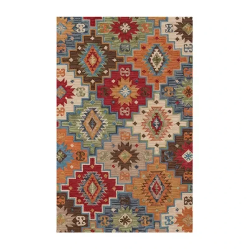 The graphic global designs of this traditional area rug are reminiscent of roads less travelled. Intricate Kazak rug motifs, including geometric patterns and repeating floral fields, are depicted in desert-inspired shades of warm red, gold, burnt sienna and sky blue. Natural 100% wool fibers and hand-tufted construction reflect the rugged sensibilities of each rug's nomadic design, while a washed finish gives the rustic rug a refined hand.