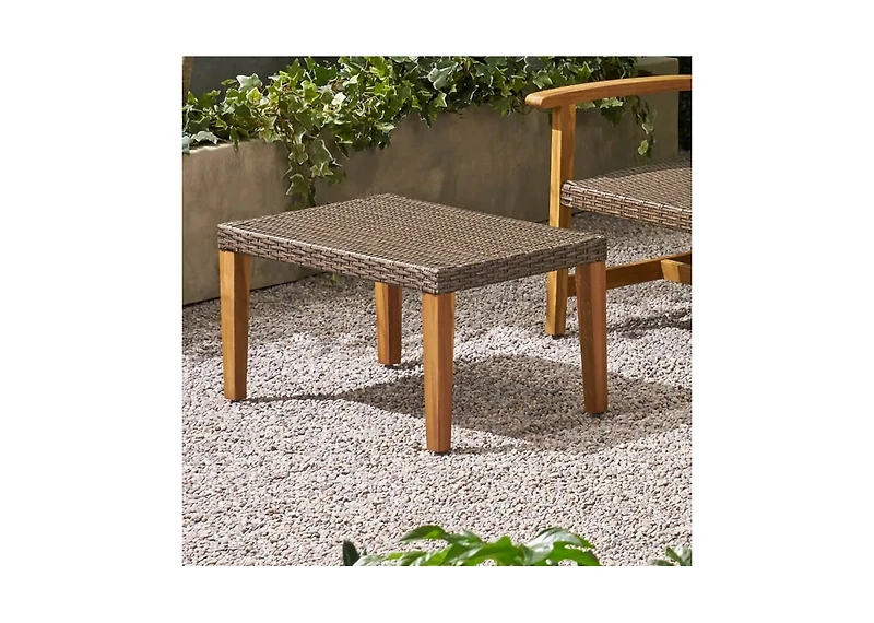 Transitional-style outdoor ottoman with solid acacia wood frame and durable woven wicker seat. Designed for comfort and style, perfect for patios, decks, or gardens, combining rustic charm with all-weather functionality.